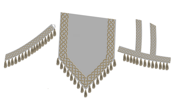 A destrier is a warhorse known for carrying knights in battles. Their flashy coats and strong build made them ideal for jousts and tournaments. The Destrier collection aims to bring medieval style tack into the modern war for reinactments and costumes. Barding is used to describe cloth or leather used for decoration on the horse. This part of the collection includes 40 different color variations. Please note that they do not come as they are to be attatched, and each piece needs to be moved independently.